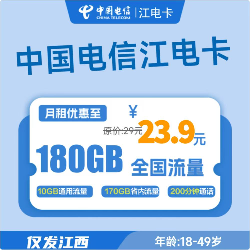 23.9元10G全国通用流量+170G省内通用流量+200分钟全国通话(仅发江西)